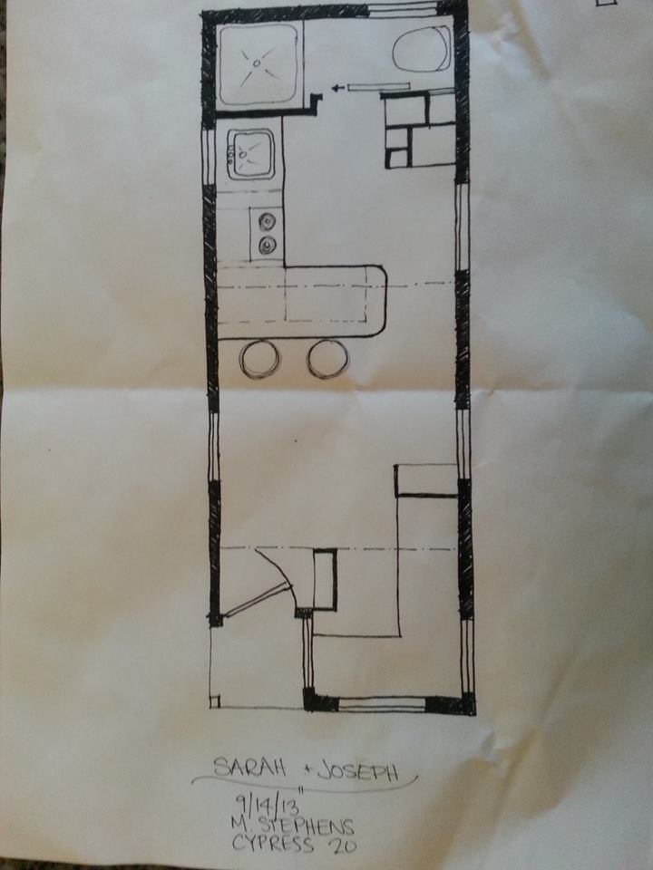 Also, we’ve been thinking about who each of us are and what we each need. Por ejemplo: Sarah needs private place to write. Joseph wants be able to be an introvert, even within a shared small space. And, we like sitting around the table together. All of this process was really helpful to start thinking about. Sarah and I were just so focused on how to frame a house, that we started letting the inner details fade. Here’s a picture of the sketch Meg made for our interior, though we feel this will be it’s own post when we get a bit closer.