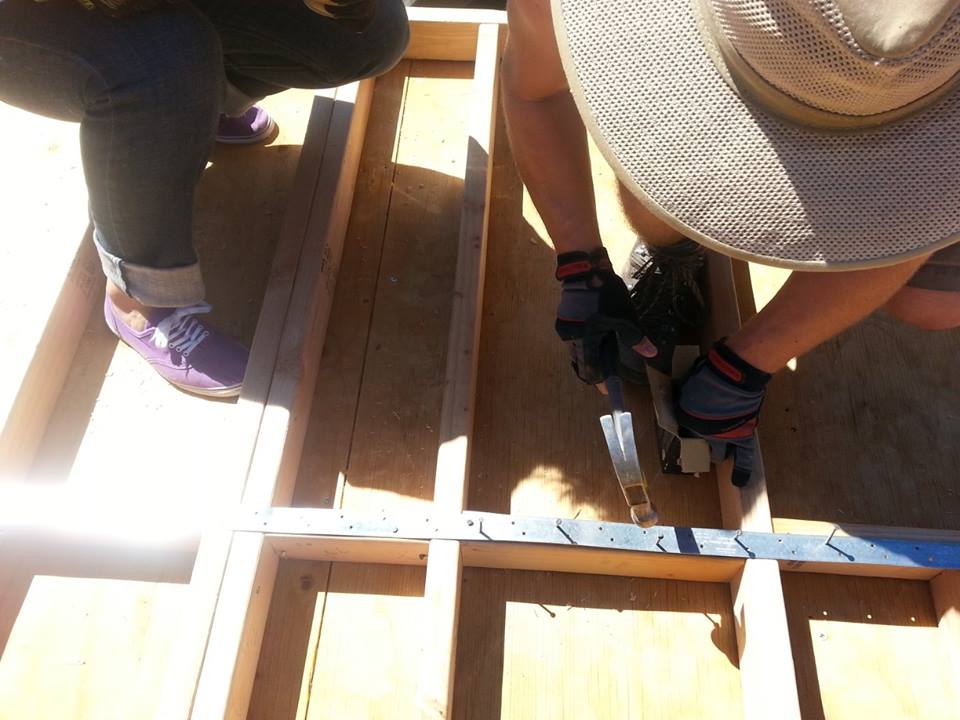Our second wall is UP! Building this wall went SO much faster than building our first wall, which is about a third as big. Meg and Bre, two of our group build compatriots, helped us measure, nail, and everything else to make this wall happen. We’ve discovered building goes much faster with three or four people than with just us two. Once we had the wall built, we got even more help. Five generous, charming, and strong Tumbleweed staffers joined us to lift the wall’s thousand pound mass up and over the welded-on trailer bolts, and then tilt it carefully into place.
